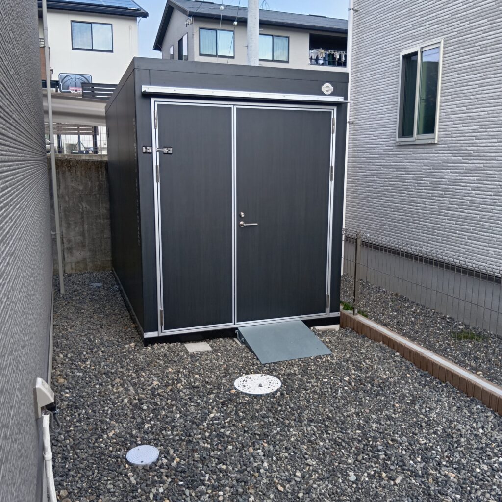 下地は勾配の無い砂利。家の裏への動線を確保して、予定していた場所にすっぽりと収まりました。