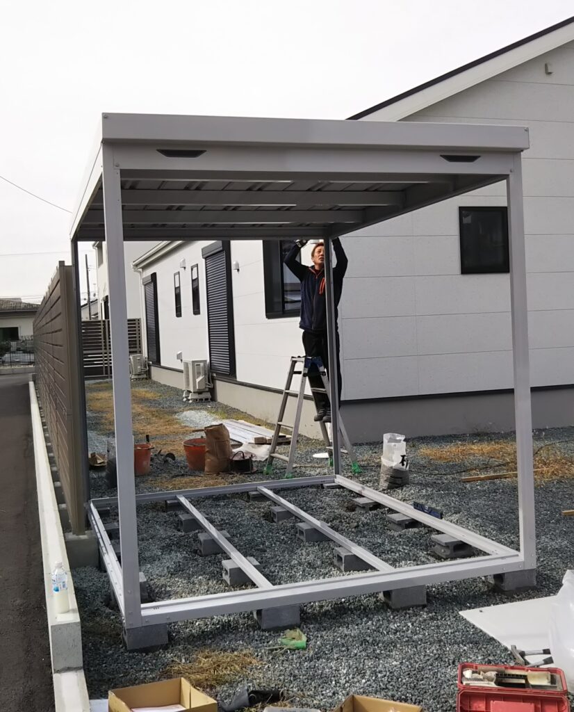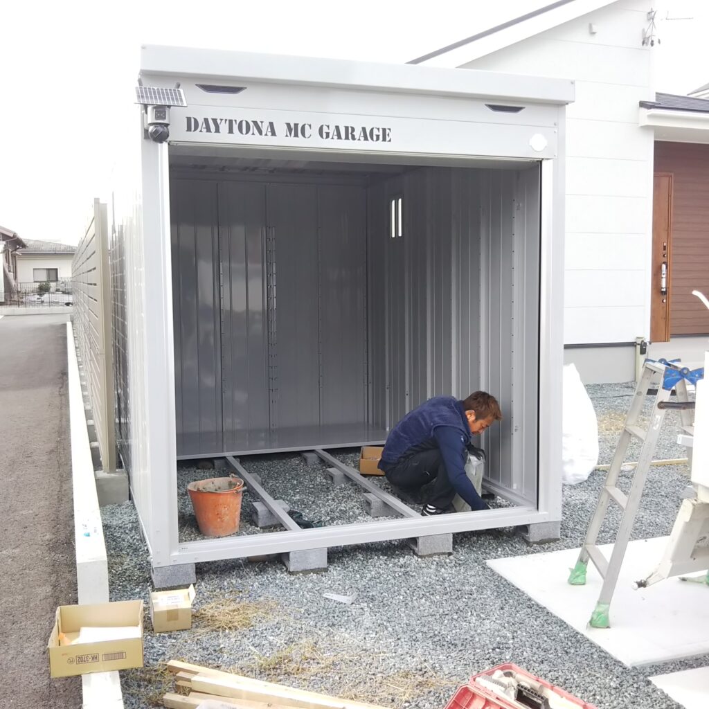 ガレージ設置場所は広いお庭の一角。現場が広く使えたため作業は順調に進み、無事ガレージ設置が完了しました。